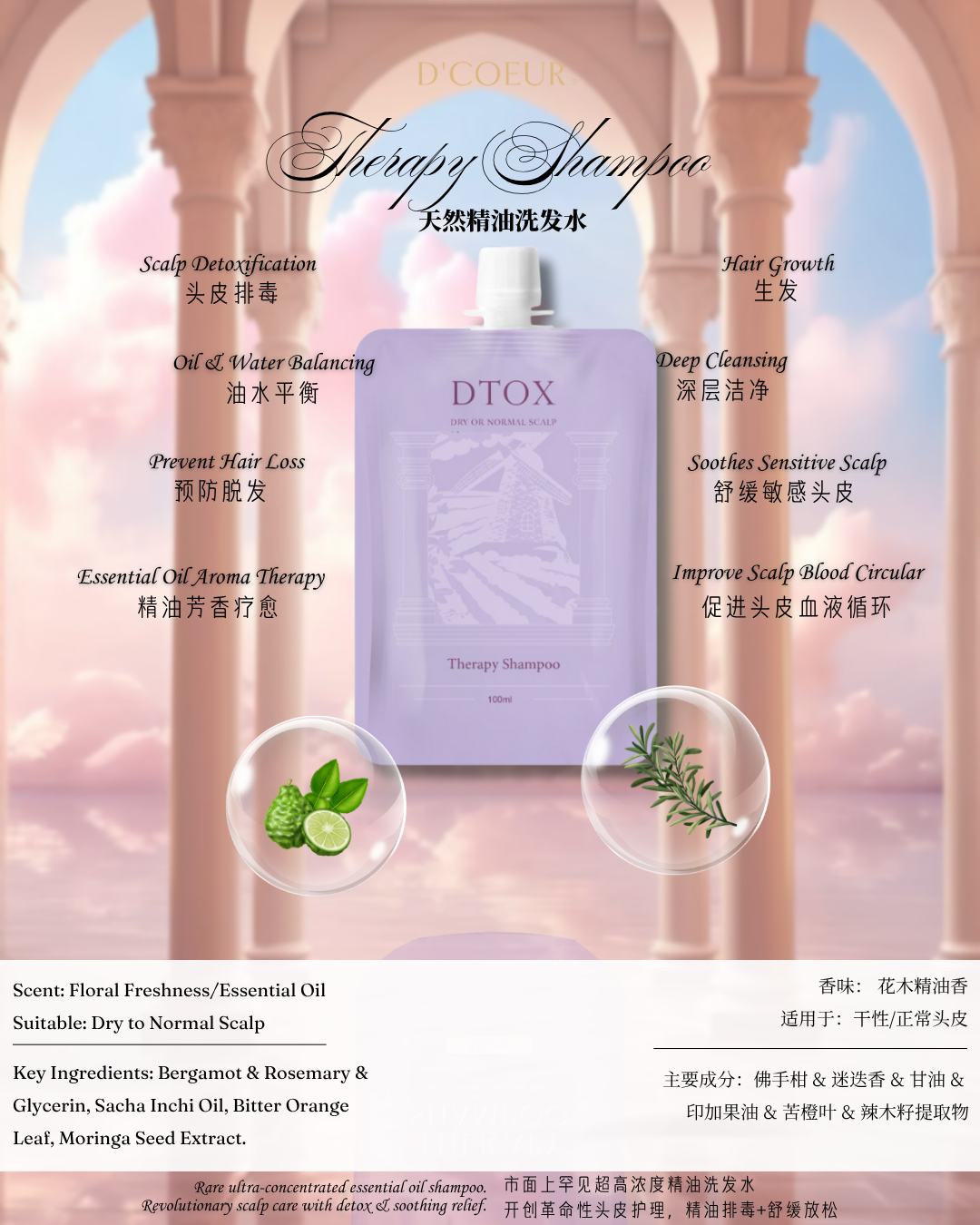 A protein base shampoo special formulated with unique blend of plant extract to smooth, cleanses, moisture your scalp and protect your hair color. Soothes and calms the sensitive dry scalp and leaves hair smooth and light. Enjoy the indulgent of refreshing hair wash in the aroma from natural essential oil of the shampoo.